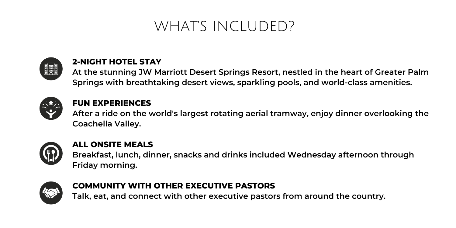 Join us for an intimate gathering of Executive Pastors. Think “TED Talk meets Roundtable." It's not a conference; no endless talking heads or “know-it-all” experts in the room. This weekend is built around important topics, intentional discussion, great meals, and meaningful connections. If you're an executive leader who knows that the best learning comes from time with other leaders, this gathering is for you.